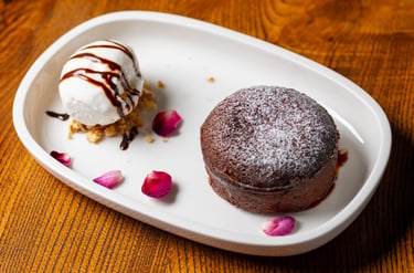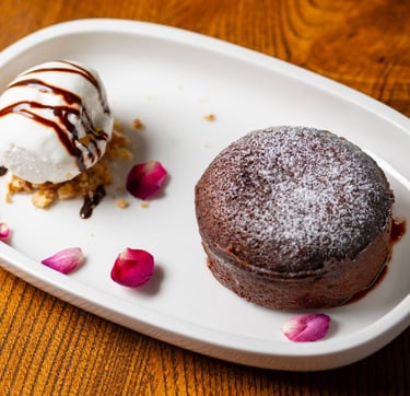 Warm chocolate cake with a molten center, served with vanilla ice cream