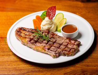 250g Black Angus steak grilled, served with mushroom, mashed potatoes, steamed vegetables