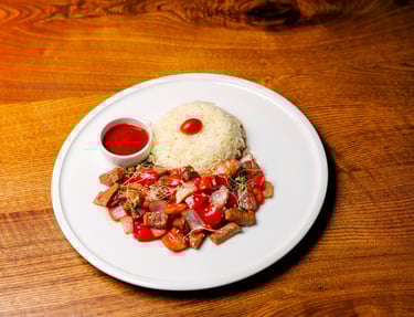 Beef, onion, peppers, chilies, rice