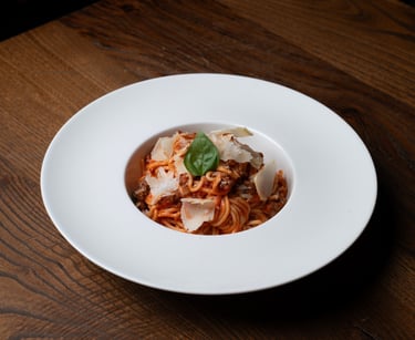 Spaghetti Pasta, Ground Beef, Pomodoro Sauce, Parmesan Cheese