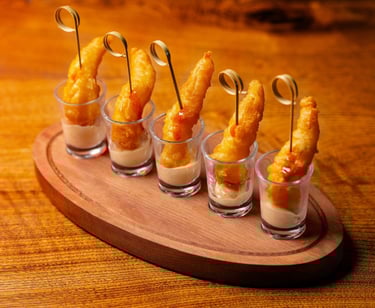 Marinated fresh shrimps in tempura batter with kimchi salsa