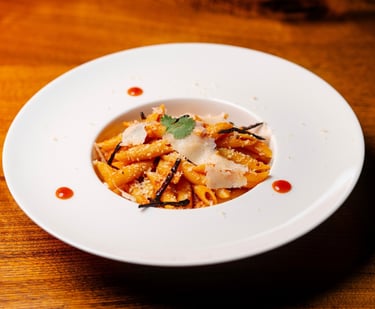 Penne pasta, Pomodoro sauce, Parmesan cheese
