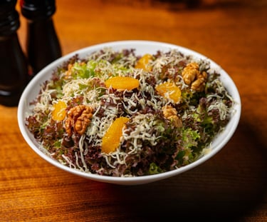 Roquefort cheese, orange pulp, Lollo Verde, walnuts, Roquefort dressing