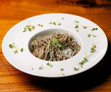 Black pasta, shrimp, provencal sauce