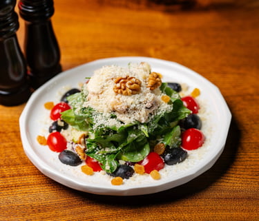 Baby rocca,mushrooms, beetroot, grapes, cherry tomatoes, apples, mixed nuts, parmesancheese, balsamic dressing