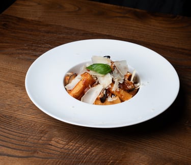 Rigatoni pasta, eggplant, Beef, Pomodoro sauces, Parmesan cheese