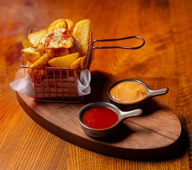 Potato wedges, ketchup, cocktail dip