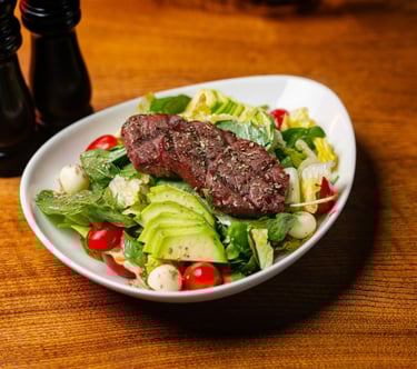 Marinated beef tenderloin, avocado, fresh mozzarella, lettuce, baby rocca, cherry tomatoes, lemon mustard dressing
