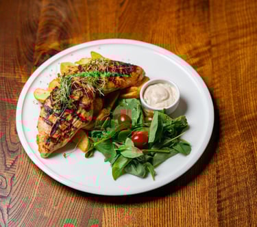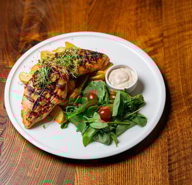 Marinated grilled fresh chicken breast, green salad, potato wedges