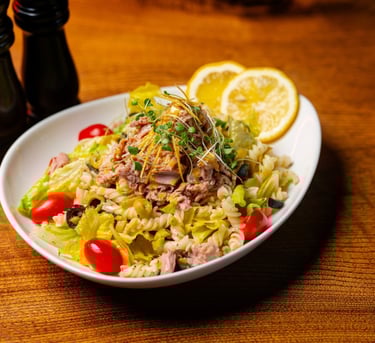 Lettuce, fusilli pasta, cherry tomatoes, olives, tuna, lemon dressing, lemon mayo