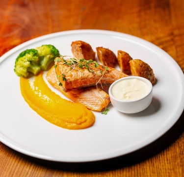 Norwegian salmon fllet with rosemary, baby potatoes, steamed vegetables